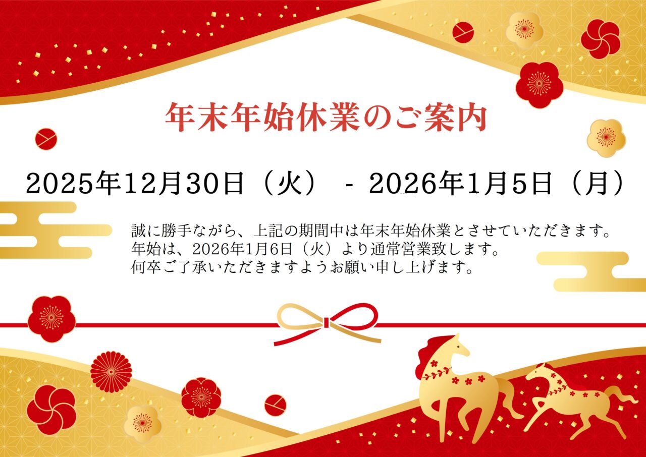 2025.12.21 最新情報 株式会社万建設興業 年末年始休暇のご案内 平素は格別のご高配を賜り、厚く御礼申し上げます。弊社では下記期間、年末年始休暇とさせていただきます。 ・令和7年12月30日(火) ~ 令和8年1月5日(月) 期間中に頂いたお問い合わせにつきましては、1月6日(火)以降のご対応となることをご了承ください。 誠に勝手ではございますがご協力のほど宜しくお願い申し上げます。