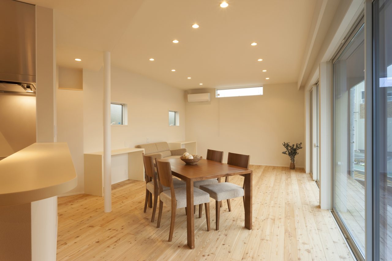 Karino 光に向かう家 敷地にはそれぞれ「色」がある。周辺環境による「色」だったり、形状による「色」だったり。それらの「色」と融け合い、納まりよく、佇み、適度に主張する。 DETA 建築地 宇都宮市下岡本町 延床面積 36.58坪 分譲地入口の三叉路の鋭角に接する特徴的な形状の計画。周辺ではすでに建物が立ち並ぶ中、歩行者や車からの視線をかわしながらもっとも光を感じる方向へ向かう。キッチンとリビングが対面しながらそれぞれが外を向き、光へ向かう。